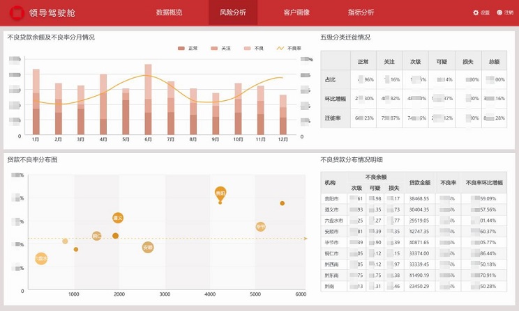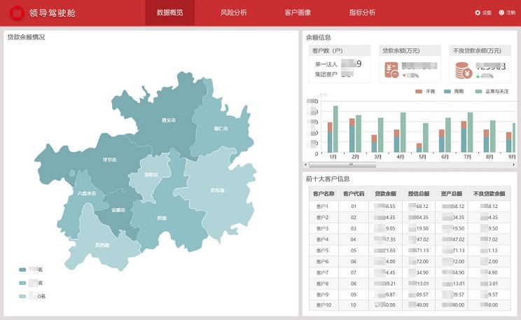 系統覆蓋了客戶風險月報的常用固定報表、分析報表、綜合查詢、等業務需求;同時為了滿足各級領導快速直觀地了解掌握全行客戶風險情況的需要,開發實現了領導駕駛艙功能;為了滿足業務人員能夠靈活便捷地對財政收支數據進一步分析,開發實現了自助分析功能。