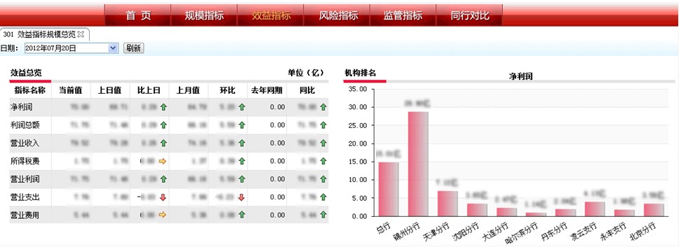 領(lǐng)導駕駛艙是對于管理者開放的模塊,包括管理者日常工作中最關(guān)注的指標,并且通過直觀的圖形的方式展示,便于管理者快速了解銀行的經(jīng)營狀況以及進行風險的預警。
